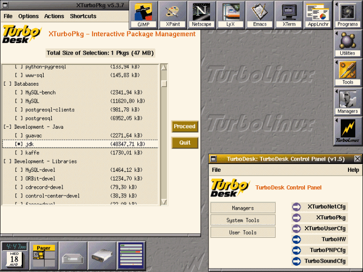 В продажу TurboLinux 3.6 поступила в июле. В новой версии пользователю предлагается выбор из нескольких сред рабочего стола и диспетчеров окон (правда, от весьма привлекательной среды TurboDesk/AfterStep компания намерена вскоре отказаться), а также программу быстрой установки, способную определять многие типы устаревших аппаратных средств, и прекрасную утилиту обновления ОС. В состав TurboLinux Workstation входит также несколько интегрированных офисных приложений, множество мультимедийных программ, средств разработки ПО и служебных утилит с открытыми исходными текстами. Конфигурирование ОС можно частично выполнять в графическом режиме.