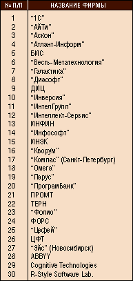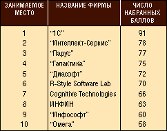 “Рейтингованию” подверглись свыше 120 компаний. Больше всех баллов (91) набрала фирма “1С” (интересно отметить, что все участники торжественной церемонии были уверены, что главный приз достанется команде Бориса Нуралиева, но никто не отгадал, с какой суммой баллов эта победа будет достигнута!). Остальные 10 самых-самых (в порядке уменьшения рейтинга) перечислены в табл. 1. В табл. 2 в алфавитном порядке приведены 30 наиболее влиятельных компаний.