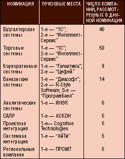 Разумеется, сравнивать разработчиков и интеграторов достаточно трудно, поэтому “Ламинфо” разделила исследуемые фирмы на 10 категорий и в каждой номинации выделила где одну, где две, а где и три лучшие компании (табл. 3).