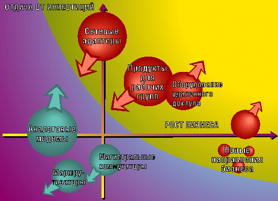 Рассказывая о планах реструктуризации, глава представительства 3Com в СНГ Люк Брюнэ отметил, что фирма оставляет в производстве лишь те продукты, которые могут обеспечить либо быстрый рост продаж, либо существенную прибыль. Для наглядности он привел график, иллюстрирующий перспективность продукции: по горизонтальной оси отложен рост объема продаж, по вертикальной - возврат инвестиций. Для всех групп продуктов стрелки показывают, как изменяется во времени положение каждой из них. В настоящее время наиболее перспективными являются устройства для рабочих групп, в том числе коммутаторы Superstack и серия продуктов OfficeConnect для небольших офисов. Сильной позицией 3Com остаются сетевые адаптеры и оборудование удаленного доступа - RAS 1500 и Total Control.