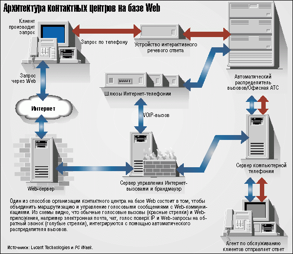 Тем, кто намерен переоснастить свои центры обработки вызовов, сегодня предлагается широкий выбор продуктов, число которых к тому же постоянно растет. Продукты, производимые традиционными поставщиками аппаратуры и ПО для центров обработки звонков, например фирмой Lucent Technologies, корпорацией Nortel Networks, фирмой Siemens Information and Communications Networks и корпорацией Rockwell Electronic Commerce, осуществляют интеграцию Web-служб и голосовой связи, используя уже имеющиеся в ядре большинства систем обработки вызовов средства автоматического распределения обращений (ACD, automatic call distributor).