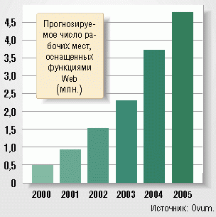 Полностью интегрированных контактных центров на базе Web пока немного. По оценке Стефана Вуда, ведущего консультанта по стратегии и технологии центров обработки вызовов из фирмы Ovum (Лондон), во всем мире в подобных центрах насчитывается не больше полумиллиона оборудованных Web-функциями операторских мест, но к 2005 г. их уже будет 4,3 млн. (см. диаграмму).