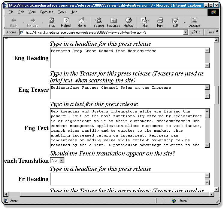 Фирма Mediasurface (Сан-Франциско, шт. Калифорния), анонсировавшая в мае новейшую версию одноименного ПО управления информационным наполнением Web, выбрала несколько иной подход к решению проблемы. Пакет Mediasurface 3 во многом реализует те же функции автоматизации документооборота и публикации, что и служба PanaSite, но кроме того еще позволяет клиентам отделить данные от их представления.