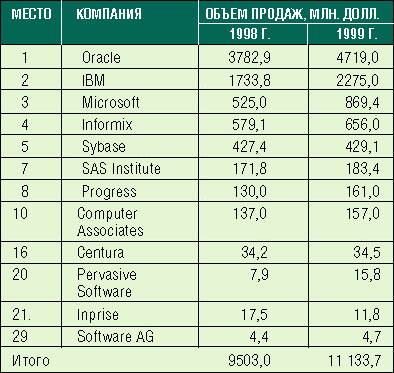 В целом, если учесть различия в методиках, полученные данные и выводы аналитиков IDC и Dataquest (см. “Мировой рынок СУБД в 1999 г.: версия Dataquest”, PC Week/RE, № 21/2000, с. 22) почти совпадают. Основная тенденция: лидеры рынка - Oracle, IBM, Microsoft - значительно увеличивают свои доли, именно это обусловливает рост всего рынка.