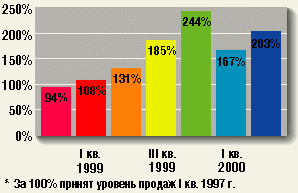 С. П.: Большинство региональных фирм сильно диверсифицированы. Они понемногу занимаются и розничной торговлей, и сборкой ПК, и системной интеграцией. Поэтому однозначно классифицировать их практически невозможно. Получилось так, что среди наших клиентов практически нет крупных интеграторов, владельцев розничных сетей или субдистрибьюторов. Так что мы ориентируемся в основном на мелкие и средние компании, делающие в большинстве своем от 20 до 50 тыс. долл. в квартал. Да, с большим количеством компаний работать труднее, чем с малым, но это придает нашему бизнесу устойчивость. Ведь даже самый лучший дилер обеспечивает нам лишь 2,2% оборота. Кроме того, широта географии партнеров обуславливает и относительную равномерность наших доходов во времени. Практика показывает, что порой одни регионы вдруг становятся более денежными, а другие - менее. Но эти случайные колебания, вызванные, как правило, притоком инвестиций в тот или иной регион, накладываются друг на друга, и в итоге доходы у нас стабильно растут, без особых всплесков или провалов. Наиболее удачными (за всю почти восьмилетнюю историю “Марвела”) были III и IV кварталы минувшего года, в целом же оборот 1999-го составил 138% по отношению к обороту 1998-го. Результаты I квартала 2000 г. также обнадеживают: они в полтора раза лучше, чем в I квартале 1999-го. На наш взгляд, компьютерный бизнес вообще находится на подъеме, поэтому желание работать в этом секторе рынка ни у кого из наших менеджеров не пропало. У них еще есть искорки в глазах. И эти искорки достаточно большие.