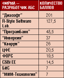 Рейтинг влиятельности фирм - разработчиков АБС рассчитывался для первых десяти компаний этого сектора рынка и определялся как долей рынка, занимаемой той или иной компанией, так и другими параметрами - удовлетворенностью клиентов функциональностью системы, ее сопровождением и т. д.