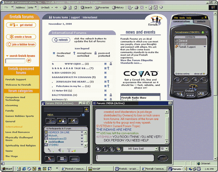 На узле Firetalk поддерживаются форумы различных типов - с модератором и с доступом по паролю. Пользователь может выбирать из имеющихся форумов (не являющихся строго замкнутыми образованиями), а может создать новый. Кроме того, предлагаются услуги виртуальных аудиторий, широковещательной и многоадресной рассылки, конференц-связи, ведения во время работы в форуме сепаратных переговоров с избранными его участниками, моментальной передачи сообщений и голосовой почты с временным ограничением 60 мин.