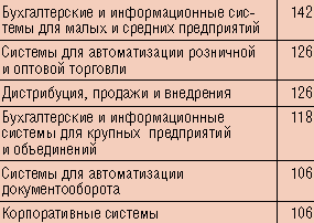 Исследование “ИНТЕХ-2000”, проводившееся осенью прошлого года маркетинговым агентством “Ламинфо”, основано на обработке и анализе результатов анкетирования 218 компаний софтверного рынка из разных регионов России. В исследовании участвовали фирмы, работающие как в области автоматизации банков, предприятий, страховых компаний и т. п., так и разработчики САПР, ГИС и пр.; как системные интеграторы, так и создатели Интернет-проектов. В целом выявилось, что наибольшее число компаний работает в следующих сегментах (всего их 19):