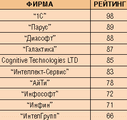 Следует отметить, что суммарный рейтинг компаний вычислялся исходя как из объективных показателей (финансовый оборот, число партнеров, стаж работы на рынке и т. д.), так и из субъективных (самооценка и взаимная оценка деятельности коллегами). (каждый из 10 параметров оценивался по пятибалльной системе.) Для ряда показателей были введены весовые коэффициенты, отличные от 1 (например, для эффективности, выставочной деятельности, PR-активности, взаимооценки). Таким образом, топ-лист десяти наиболее влиятельных компаний российского рынка делового ПО выглядит следующим образом: