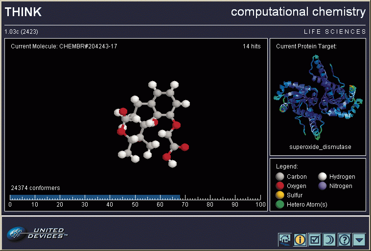 Приложение, созданное в United Devices (см. иллюстрацию), может работать в фоновом режиме и даже выполнять роль скринсэйвера, но при этом программа ищет топологические соответствия между молекулами лекарственных препаратов и протеинов, что может сыграть существенную роль при лечении рака.
