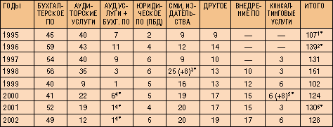 *3. В скобках приведено число фирм, которые, помимо своей основной деятельности (аудит, разработка ПО, юридические и пр. услуги), занимаются также издательскими проектами.
