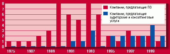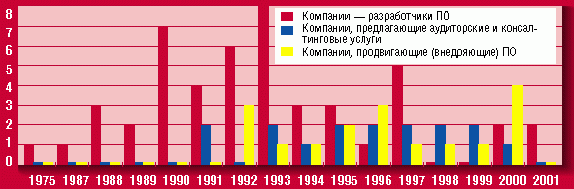 Компании, внедряющие ПО. В диаграмму нынешнего года добавлены 17 компаний, продвигающих и внедряющих ПО других разработчиков (плюс иногда и свои разработки). Следует отметить, что из этого числа более двух третей (14) составляют фирмы - партнеры “1С” (дилеры, франчайзи, дочерние компании и т. д.), внедряющие как стандартные конфигурации своего “вендора” (а иногда к ним прибавляются и программы других производителей), так и свои разработки на платформе “1С”. Здесь интересен “всплеск”, относящийся к 2000 г.: все три компании, возникшие в этот период, - партнеры “1С”.