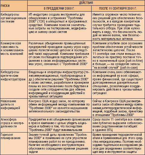 Наблюдатели отмечают, что потери могли быть больше, но сработали планы действий в чрезвычайных ситуациях (disaster recovery plans), имеющиеся у большинства американских компаний. Заметим, что многие из этих планов появились в преддверии 2000 г. в связи с так называемой “Проблемой 2000” (см. табл. 1).