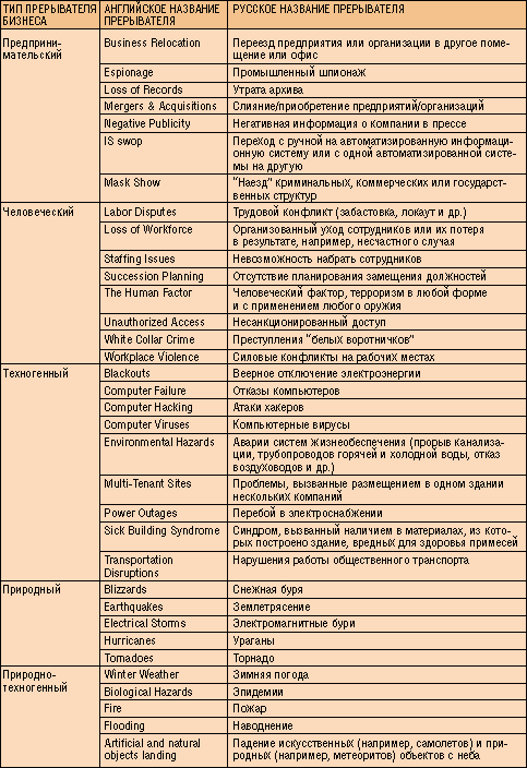 Таблица 2. Классификация прерывателей (рисков) бизнеса (не исчерпывающая)