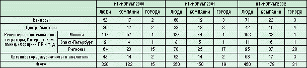 Для сравнения: в прошлом году (см. PC Week/RE, № 14/2001, с. 1) форум собрал свыше 350 человек из 150 компаний, а в позапрошлом (см. PC Week/RE, № 11/2000, с. 1) - более 320 сотрудников 122 отечественных и зарубежных фирм из 15 городов *1.