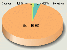 Почти 93,9% продаж компьютеров в натуральном выражении приходится на настольные ПК, более 4,3% на ноутбуки и 1,8% - на серверы (на платформе Intel).
