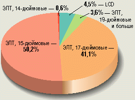Общий объем продаж на свободном рынке мониторов составил чуть более 2,5 млн. устройств на общую сумму около 650 млн. долл. Показатели 2000 г. превышены на 31% в натуральном выражении и на 47% в денежном. Такая диспропорция обусловлена полным уходом с рынка ранее популярных 14-дюймовых и заметным сокращением (до 50%) доли 15-дюймовых ЭЛТ-мониторов. Продажи 17-дюймовых ЭЛТ-мониторов (в первую очередь плоских) постоянно росли, что позволило им к концу года выйти в лидеры продаж. В целом за отчетный период доля этих устройств составила 41%. Наиболее быстрыми темпами развивался сегмент ЖК-мониторов, и его рыночная доля по итогам года достигла 4,5%.