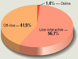 Рост рынка по сравнению с 2000 г. составил 37,5% в натуральном выражении и более 50% - в денежном. Самые простые ИБП, выполненные по технологии off-line, составляют по итогам года всего около 42% рынка в натуральном выражении, в то время как в 2000-м на их долю приходилось свыше половины рынка. Именно с этим в первую очередь связан опережающий рост денежных показателей. Существенно выросла доля line-interactive ИБП - почти до 57%, и практически не изменились позиции online - 1,4%.