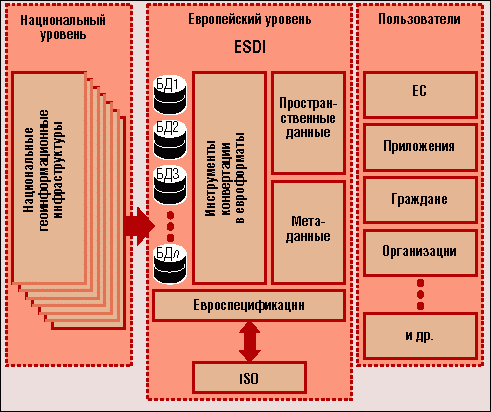 Таких организаций действительно много, большинство из них имеют своей целью направлять, организовывать и информировать: разницу между комиссиями, комитетами и комитетиками, прячущимися за сложными аббревиатурами, трудно разглядеть без микроскопа. А тот факт, что Европа состоит из многих стран и говорит на разных языках, делает позицию координатора весьма заманчивой и очевидно необходимой. И конечно же все эти организации постоянно проводят съезды и слеты, на которых, что примечательно, мелькают в массе своей одни и те же лица. Все эти комитеты занимаются интеграцией разнородной и разноформатной географической информации. Не стал исключением и новый проект в этой области, получивший название INSPIRE (The Infrastructure for Spatial Information in Europe, www.ec-gis.org/inspire/). Его цель - создание Европейской геоинформационной инфраструктуры (European Spatial Data Infrastructure, ESDI). Общие затраты на ее организацию ESDI оцениваются в сумму от 500 млн. до 1,5 млрд. евро. В июле Европейская комиссия по ГИС и геоинформации провела в Дублине семинар под девизом “ESDI - работа продолжается” (www.ec-gis.org/Workshops/8ec-gis).