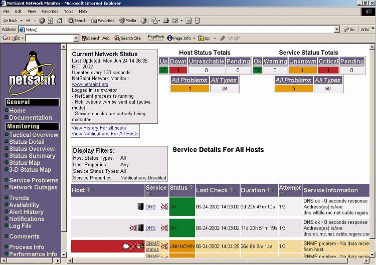 Программа NetSaint Этана Галстэда наглядно демонстрирует наиболее важные из выявленных проблем