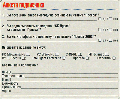 Уважаемые читатели! Заполненная и вырезанная из еженедельника PC Week/RE, № 38/2002 и № 39/2002 короткая анкета, предъявленная на стенде издательского дома “СК Пресс”, даст вам возможность выиграть бесплатную подписку на выбранное вами издание. Анкета с логотипом выставки “Пресса”, вырезанная из еженедельника PC Week/RE, № 39/2002, является пригласительным билетом.