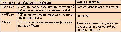 Новое интегрированное ПО, пред- назначенное как для управления контентом, так и для поддержки совместной работы пользователей, намного упростит предприятиям публикацию и архивирование контента, созданного с помощью средств поддержки коллективной работы (ПКР). Производители пакетов ПКР Open Text (www.opentext.com) и NextPage (www.nextpage.com) анонсировали в сентябре продукты, упрощающие публикацию информации на Web-узлах. А фирмы Documentum (www.documentum.com) и Artesia Technology включили инструменты ПКР в приложения управления контентом и цифровыми активами.