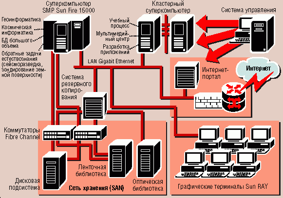 Суперкомпьютерный центр (см. рисунок) основан на новейшей технике фирмы Sun Microsystems - кластерном суперкомпьютере Sun Fire 15000 с пиковой производительностью до 130 млрд. операций в секунду (для сравнения: у суперкомпьютеров Hitachi этот показатель не превышает 101,3 млрд. операций в секунду).