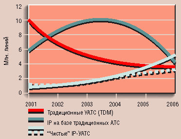 TDM-телефонии, по данным за 2001 г., в США принадлежит три четверти рынка общим объемом около 10 млн. портов в год (74%), чистой IP-телефонии - 10% и конвергентным решениям, IP поверх TDM, - 16%. По его прогнозам, 2003-2004 гг. пройдут под знаком роста продаж IP-портов на базе традиционных АТС и только затем начнется снижение доли IP/TDM и победоносное шествие чистого IP. Более того, у классической TDM-телефонии всегда сохранится своя ниша. Это аналоговая телефония, центры обработки вызовов по работе с населением, экстренные службы и многие другие специфические области применения, в которых никогда не будет широкополосных каналов связи.