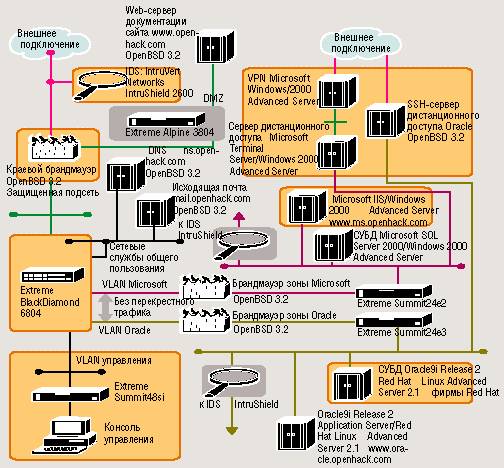 1. Используя несколько Ethernet-портов IDS (системы обнаружения вторжений) IntruShield 2600 фирмы IntruVert Networks, мы могли одновременно следить за тремя сегментами сети. Однако наш наиболее важный трафик пересылался посредством Secure HTTP и поэтому, к сожалению, не мог контролироваться IDS, что является общей проблемой всех подобных систем. 2. ОС OpenBSD оснащена функциями брандмауэра, перенаправления портов, трансляции сетевых адресов и защиты сети от обманных действий. Мы по достоинству оценили способность pf (встроенного фильтра пакетов) брандмауэра OpenBSD регистрировать заблокированные пакеты через интерфейс виртуальной сети вместо syslog, в также возможность их сохранения в формате tcpdump. Правда, мы заметили несколько проблем, связанных с тем, что pf-правила, написанные с использованием опции брандмауэра “keep state”, могли вызывать некорректную блокировку пакетов, возвращаемых в результате входящего подключения. 3. Используемые нами коммутаторы фирмы Extreme Networks показали себя во время теста как простые и надежные устройства. В качестве дополнительной меры безопасности мы задействовали правила контроля трафика на уровне портов для блокировки обмена между IP-адресами, которым не следовало сообщаться друг с другом. 4. В конфигурации Oracle нам пришлось уделить специальное внимание проблемам VPN-взаимодействия, так как мы не смогли обнаружить VPN-клиент, которому полагалось функционировать на Solaris-клиентах Oracle и подключаться к VPN на базе OpenBSD. Мы подключили бастионный хост SSH (Secure Shell) перед периметром, хотя и сконфигурировали брандмауэр на сервере так, чтобы он пропускал только IP-адреса разрешенных систем. Для VPN-взаимодействия в конфигурации Microsoft нам достаточно было подключить Windows-клиенты к Windows-серверам. 5. Microsoft решала задачи криптозащиты на среднеуровневой системе IIS (Internet Information Services), так как необходимые библиотеки .Net внутри Microsoft SQL Server не работали. Но в ряде случаев предпочтительнее шифрование в СУБД, и будущий выпуск SQL Server Yukon должен полностью поддерживать .Net Framework. Это обеспечит переносимость кода на базе Java в другие комбинации сервера приложений и СУБД. 6. Мы управляли коммутаторами при помощи старого доброго нуль-модемного кабеля, не создавая отдельной виртуальной ЛВС. Но в перспективе лучшим выбором будет VLAN. 7. Дефект приложения, обнаруженный Джереми Поутитом, позволял осуществить при определенных, довольно редких, обстоятельствах атаку с заимствованием прав. Однако базы данных имели табличные ограничения, создававшие лишний уровень безопасности, и поэтому даже злонамеренное использование этого дефекта не могло изменить информацию в базах данных. Наличие многих независимых уровней защиты - ключ к крепкой обороне. |
