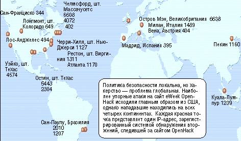ИТ-безопасность, как уже показали прошлые тесты OpenHack, представляет собой глобальную проблему. Первые две тестовые системы OpenHack взломал один и тот же хакер из Гибралтара по имени Луис Мора. По данным IDS-мониторинга сайта, двадцать наиболее активных атак OpenHack 4 велись из восьми разных стран четырех континентов (см. карту).