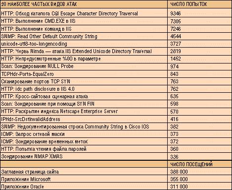 За время тестирования сайт подвергся почти 53 тысячам атак. Наиболее распространенными видами нападений, обнаруженных системой IDS, были стандартные атаки на Web-сервер на основе URL-кодирования и атаки с просачиванием через дерево Web-каталогов при помощи попыток обхода каталогов. Из других частых атак следует назвать низкоуровневые приемы использования TCP/IP и различные формы зондирования (перечень двадцати самых распространенных способов атак приведен в таблице).