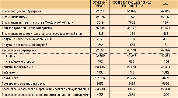 На странице www.mosreg.ru/pgobladm/let2002.htm размещены статистическая форма по обращениям граждан с 1 января по 31 декабря 2002 г. (в сравнении с соответствующим периодом прошлого года). В этой таблице (часть ее приведена в данной статье) собраны данные об общем количестве обращений; о количестве граждан, побывавших на личном приеме; о количестве коллективных обращений; о количестве рассмотренных обращений (в срок, с нарушением срока); результаты рассмотрения сообщений (решено положительно, отказано, разъяснено, проверено с выездом на место). Ориентируясь на подобную статистику, руководство осуществляет контроль за исполнением распоряжений, выбирает приоритетные направления развития и т. п.
