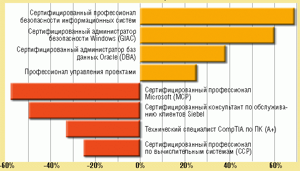 Проблему усложняет и то, что мода на специальности меняется так же быстро, как у подростков на одежду. Так, по данным Foote Partners, прибавка, полагавшаяся обладателям общих и начальных сертификатов наподобие Microsoft Certified Professional, за последние два года снизилась на 21,4%, тогда как отвечающим за безопасность в это же время стали предлагать на 31,2% больше (см. диаграмму).