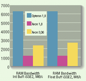 Кроме калифорнийского сервера на платформе AMD Melody (набор микросхем AMD 8000) с двумя 1,8 ГГц ЦП Opteron 244 и 4 Гб ОЗУ мы протестировали “очно” сервер AquaServer T125 на наборе микросхем Intel 7500 с двумя 1,8 ГГц процессорами Xeon и рабочую станцию Depo Race 750 с двумя 3,06 ГГц процессорами Xeon, оснащенными средствами HyperThreading, на НМС 7505. Выводы из результатов тестирования, которые полностью будут опубликованы в PC Magazine/RE, № 5/2003, каждый может сделать сам; отметим лишь явное преимущество ЦП Opteron в тестах пропускной способности памяти, которое ему обеспечил встроенный контроллер, работающий на полной частоте процессора.