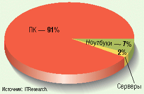 Около 91% продаж в натуральном выражении приходится на настольные компьютеры, почти 7% на ноутбуки и примерно 2% - на серверы.