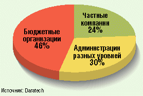Бюджетные организации мира вносят все более значительный вклад в рост рынка. Так, почти половину дохода, полученного компаниями - участниками рынка ГИС, составили средства государственных структур, имеющих отношение к инженерным сетям, телекоммуникациям, транспорту и образованию, при этом суммы, потраченные на автоматизацию инженерных сетей, возросли в 2002-м на 8%. Еще 30% доходов поступило от администраций всевозможных уровней, использующих ГИС для управления и развития вверенных им территорий, причем 67% мировых доходов в этой категории обеспечили местные власти и 33% - федеральные. Частные компании оказались куда менее активными потребителями геоинформационного ПО и услуг: их доля - всего около 24%.
