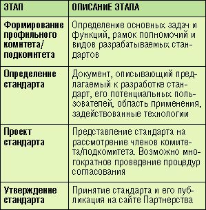 В определенной степени учреждение профильного комитета Партнерства - это этап формулирования идеи, а точнее, исходная точка этого этапа, поскольку формально первым шагом по созданию стандарта Партнерства является утверждение Определения стандарта.