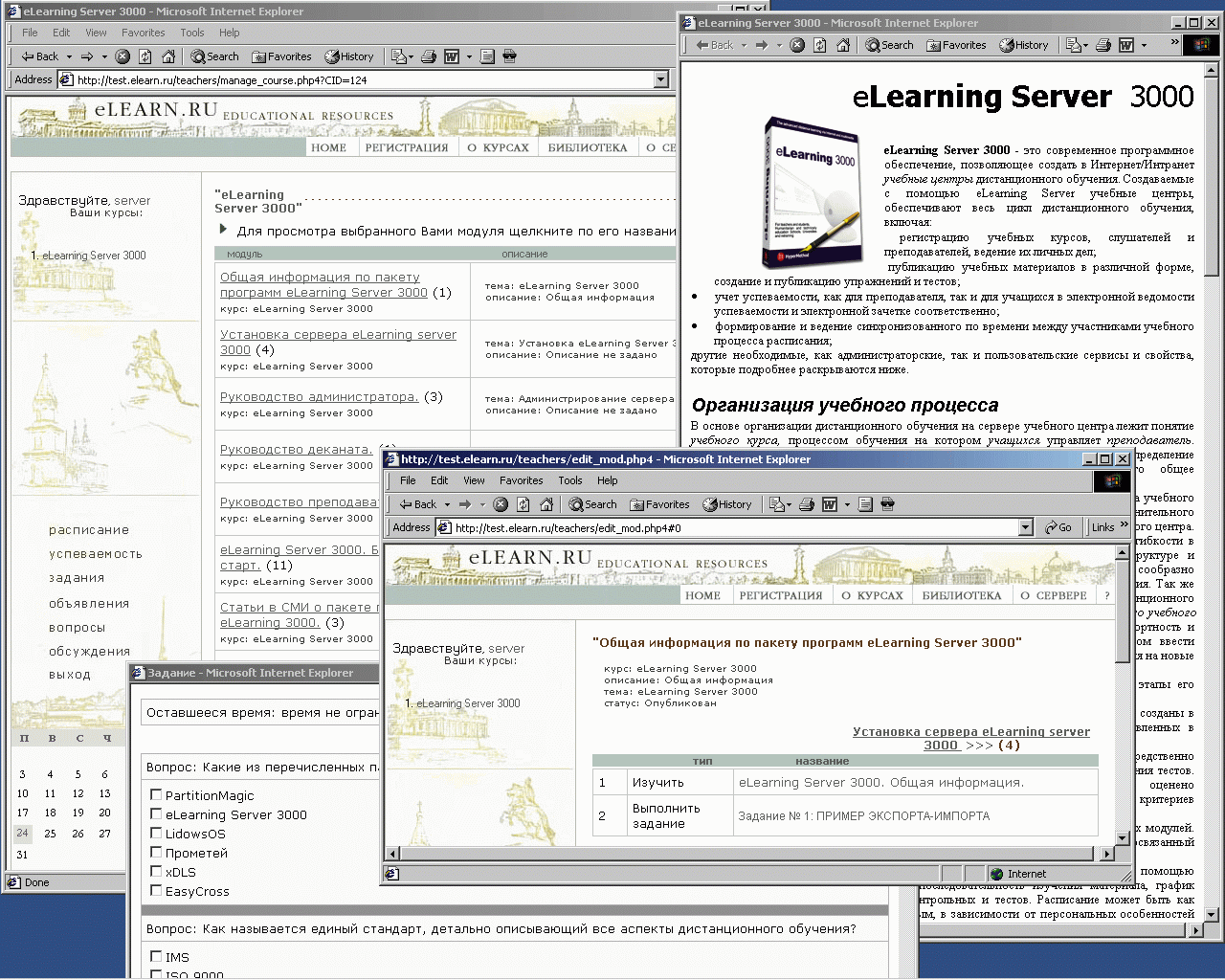 eLearning Server - специализированный и заметно более сложный пакет. Это полноценный сервер системы дистанционного обучения (СДО), причем допускающий как развертывание для применения пользователями всего Интернета, так и организацию частной обучающей сети на базе интранет- или экстранет-технологий.