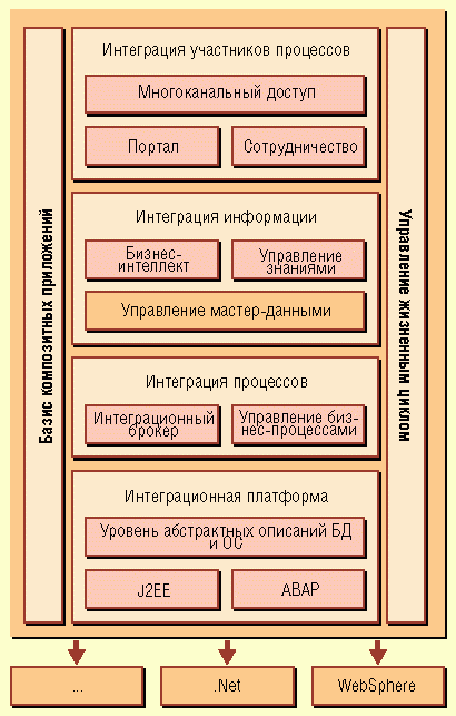 Поиск пути привел гигантов ИТ-индустрии к формированию новой информационной парадигмы - интеграционной - и к борьбе за платформы для приложений: ведь тот, кто определяет платформы, будет определять и часть архитектуры приложений. Неудивительно поэтому, что основные поставщики прикладного ПО - SAP и Microsoft - активно вступили в борьбу за рынок будущего. Благодаря тесной связи с программными технологиями поставщики аппаратных средств IBM и Sun тоже считают, что у них есть хорошие шансы победить.