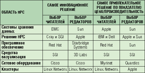 Прежде всего наибольшее количество читательских наград досталось компании SGI, тогда как редакторы предпочитают решения компании Sun. В области систем визуализации компания SGI явно не собирается сдавать свои позиции, так же как и Cisco в сфере сетевых технологий. Открытием сезона в кластеростроении является Linux Networx. Неожиданностью стало присуждение Apple значительного числа наград за создание решений HPC и систем хранения данных.