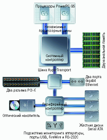 Подвергся модификации и чип, обслуживающий периферийные устройства. В нем вы не найдете звуковой подсистемы, поддержки IEEE 802.11g Airport Extreme или Bluetooth, а вот порты USB 2.0, FireWire 400 и FireWire 800 и порт интерфейса RS-232C остались. Как и в случае c Power Mac G5, Parallel ATA используется лишь для работы с оптическим накопителем, а жесткие диски обслуживаются интерфейсами Serial ATA (правда, здесь их уже не два, а три).