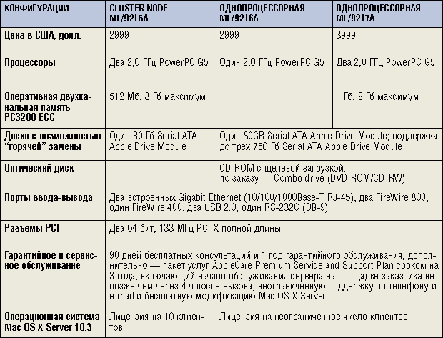 Все конфигурации поставляются с версией операционной системы Mac OS X Server 10.3 Panther; для Cluster Node число одновременно обслуживаемых сервером пользователей ограничено десятью, в остальных случаях ограничений нет. Более подробные данные можно найти в табл. 1.