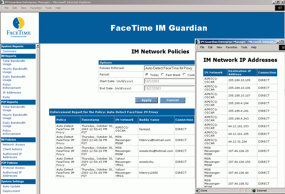 Разработанный FaceTime Communications продукт IM Guardian обеспечивает безопасность приложений IM (мгновенный обмен сообщениями) и P2P (взаимодействие ПК через Интернет без посредничества серверов).