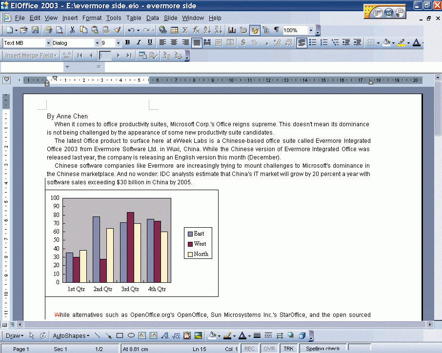 Специалисты eWeek Labs недавно протестировали комплект Evermore Integrated Office 2003 фирмы Evermore Software из китайского города Вудзи. Первая версия этого пакета с поддержкой китайского языка появилась еще в прошлом году, а теперь компания подготовила и англоязычный вариант.
