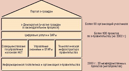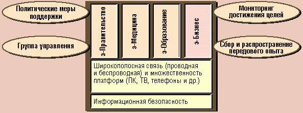 Можно сказать, что национальные и наднациональные программы построения информационного общества и электронизации стран ("э-Страна") приобрели устойчивую форму (см., в частности, рис. 1). Аналогично выглядят структуры программы "э-Мексика" (www.e-mexico.gob.mx), разработанной и реализуемой с помощью Всемирного банка, и программы построения информационного общества в Германии (см. таблицу), о которых доложено на встрече в верхах. Каждая из них, как правило, содержит подпрограммы информатизации правительства, медицины, образования и бизнеса. Развиваемые в их рамках поддерживающие технологии (информационные, коммуникационные, законодательные и др.) могут различаться, но сейчас все страны пришли к пониманию того, что для электронного образования и медицины нужен широкополосный доступ от 10 до 100 Мбит/с, а информационная безопасность является основой доверия граждан и бизнеса к электронным системам. Мероприятия программ поддерживаются политическими мерами на самом верхнем уровне государственной власти и группой управления. Постоянно осуществляется мониторинг достижения поставленных ими целей и распространяются получаемые решения.