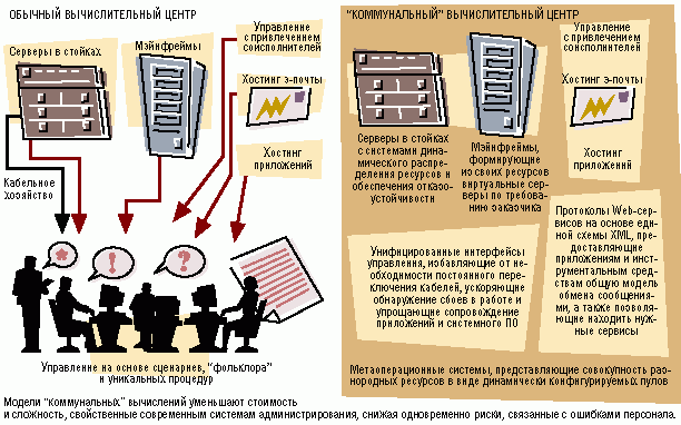 У фирмы Sun Microsystems другой подход к снижению стоимости администрирования серверных ферм. Ее концепция "коммунальных" вычислений под названием N1 предполагает создание того, что директор по разработке этой технологии Йел Ченг назвал "метаоперационной системой, способной управлять системными ресурсами и делать это автоматически, по требованию и в распределенной среде".