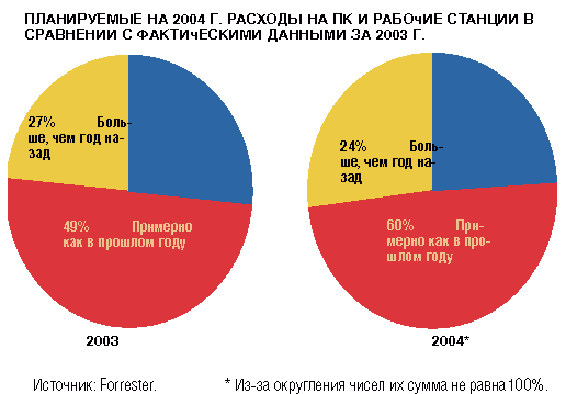 Несмотря на осторожность ИТ-руководителей в оценке объемов затрат на ИТ в 2004 г., Forrester полагает, что отложенный спрос на замену ПК впервые за последние четыре приведет к росту вложений в оборудование - с 77 млрд. долл. в 2003 г. до 84 млрд. в 2004-м.