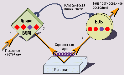 Готовится пара сцепленных фотонов, скажем, 2 и 3, причем готовится так, чтобы состояние фотона 2 всегда было ортогонально к состоянию фотона 3 (как это делается, будет рассмотрено ниже). Иначе говоря, если, например, фотон 2 поляризован горизонтально, фотон 3 будет поляризован вертикально и наоборот. После этого фотоны рассылаются в разные географические точки. Традиционно одну из этих точек принято обозначать буквой А (Алиса), а другую - буквой Б (Боб). Алиса получает фотон 2, а Боб - фотон 3. Предполагается, что Алиса уже располагает неким фотоном 1, находящимся в неопределенном состоянии, неизвестном ни Алисе, ни Бобу.