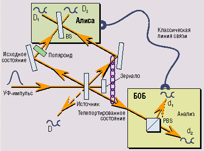 И вот с этим мнением мы позволим себе не согласиться. Фотон, как и любой материальный объект, несет с собой некий (возможно, очень большой) объем информации. Напомним, что состояние фотона (электрона, протона и т. д.) описывается волновой функцией - комплексной функцией, определенной на всей пространственной оси. И что с того, что сегодня мы не умеем воспользоваться большей частью этой информации. Мы ведь находимся в самом начале пути. Что же до экспериментальной установки, показанной на рис. 2, то это ни в коей мере не макет телекоммуникационного канала. Ее единственная цель - продемонстрировать в эксперименте саму возможность квантовой телепортации.