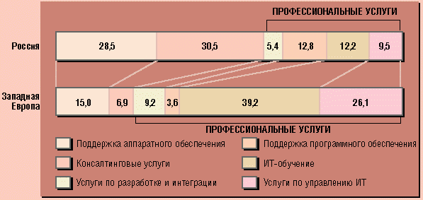 Диаграмма 1. Структура рынка ИТ-услуг России и Западной Европы, 2002 г.